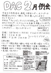 2月例会は、DACっ子から高校生・大学生リーダー、元リーダーの協会員まで様々な世代が集まる大型キャンプ”冬の集い”!!
