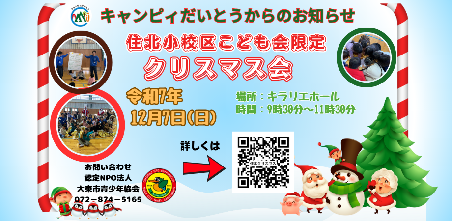 ようこそ認定NPO法人 大東市青少年協会へ 大東市青少年協会とは キャンプリーダー募集 会報誌(キャンピィだいとうのHPへ) お問合せ リンク イベント情報 ほうかごBaseCamp@こみってぃさろん 住北小校区こども会 講師紹介 キャンピィだいとう 青少年ルーム サポートについて サポート会員 寄付金 遺贈・相続財産の寄付をする 備品の寄付 新着情報 2025年10月13日 NEW! 問い合わせ 2025年10月11日 20259.28 ODSシャボン玉博士になろう! 2025年10月10日 住北小校区こども会 2025年10月5日 2025.9.20-21 DAC9月例会 上期生合宿 2025年10月4日 2025.9.14-15 秋の高校生キャンプ お知らせ一覧 募集中のキャンプ 令和7年度【住北小校区こども会】クリスマス会 ⚠️会場は大東市民会館キラリエホールになります。住北小校区こども会!クリスマス会のおしらせ🎄 住北小校区こども会のみんな、メリークリスマス☆… お味噌作りを楽しむ会 おとな・ファミリー部 令和7年11月30日(日)お味噌作りを楽しむ会 前々日にお豆を水につけて、前日にコトコト柔らかく炊き上げ、当日ミキ… ODS(アウトドアスクール)『食欲の秋!落ち葉で焼き芋』 日帰り企画!ODS(アウトドアスクール)11月24日 (月・祝) 『食欲の秋!落ち葉で焼き芋』 落ち葉を使って焼き芋作りに挑戦だ!【受付期… ODS ハロウィンキャンプ (日帰りです) ODS日帰りアウトドアスクール!10月26日 (日)『ハロウィンキャンプ』==========Trick or Treat!キャンピィだいと… 募集中のキャンプ活動 一覧ページへ青少年ルーム来館予約システム地方創生SDGs官民連携 プラットフォームNPO法人 大東市青少年協会のFacebookNPO法人 大東市青少年協会のXほうかごBaseCampのX営業時間・情報 〒574-0036 大阪府大東市末広町1-301 生涯学習センターアクロス1F 青少年ルーム TEL:072-874-5165 FAX:072-886-3152 ysdaito@ysdnet.ne.jp 受付時間:12:00~21:00 開館時間: 9:00~21:00 休館日:第2木曜日 協賛いただいている企業の皆様 (順序不同)