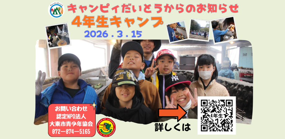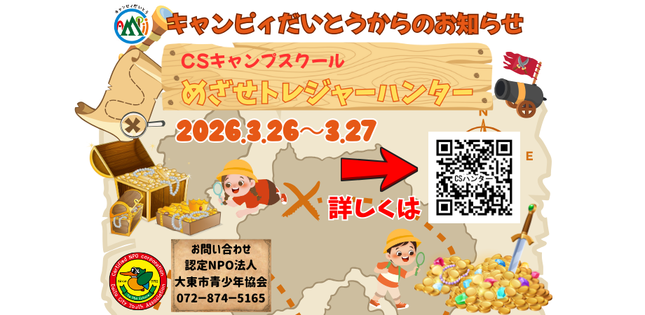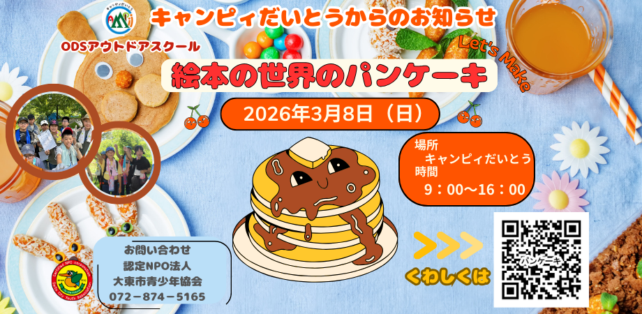 発行物2025.12.05 2026.01.19 ハッギン 2025年度 冬のわくわく号 Loading... Taking too long? Reload document | Open in new tab Download [3.07 MB] ODS(アウトドアスクール)『絵本の世界のパンケーキ』 日帰り企画!ODS(アウトドアスクール)3月8日(日)『絵本の世界のパンケーキ』 パンケーキ作りを楽しもう! 絵本の世界のよ… 4年生キャンプ 日帰りキャンプの初体験!初めての方大歓迎! 3月15日(日) 『4年生キャンプ』 いろんな学校の4年生と思い出を作ろう! キャンプしたこ… CS『めざせ!トレジャーハンター』 宿泊企画!CS(キャンプスクール)3月26日(木)~3月27日(金)『めざせ!トレジャーハンター』 ==========自然に囲まれたキャン… イキイキ生きる”人”と”場”を一緒に創りましょう!大東市青少年協会では、さまざまな体験活動を通して青少年の健全育成を行っています。 私たちの活動は、応援してくださるみなさまからの寄付で支えられています。 あなたも「寄付」でつながりませんか? 大東市青少年協会に寄付をする! (寄付サイトSyncableに繋がります。)