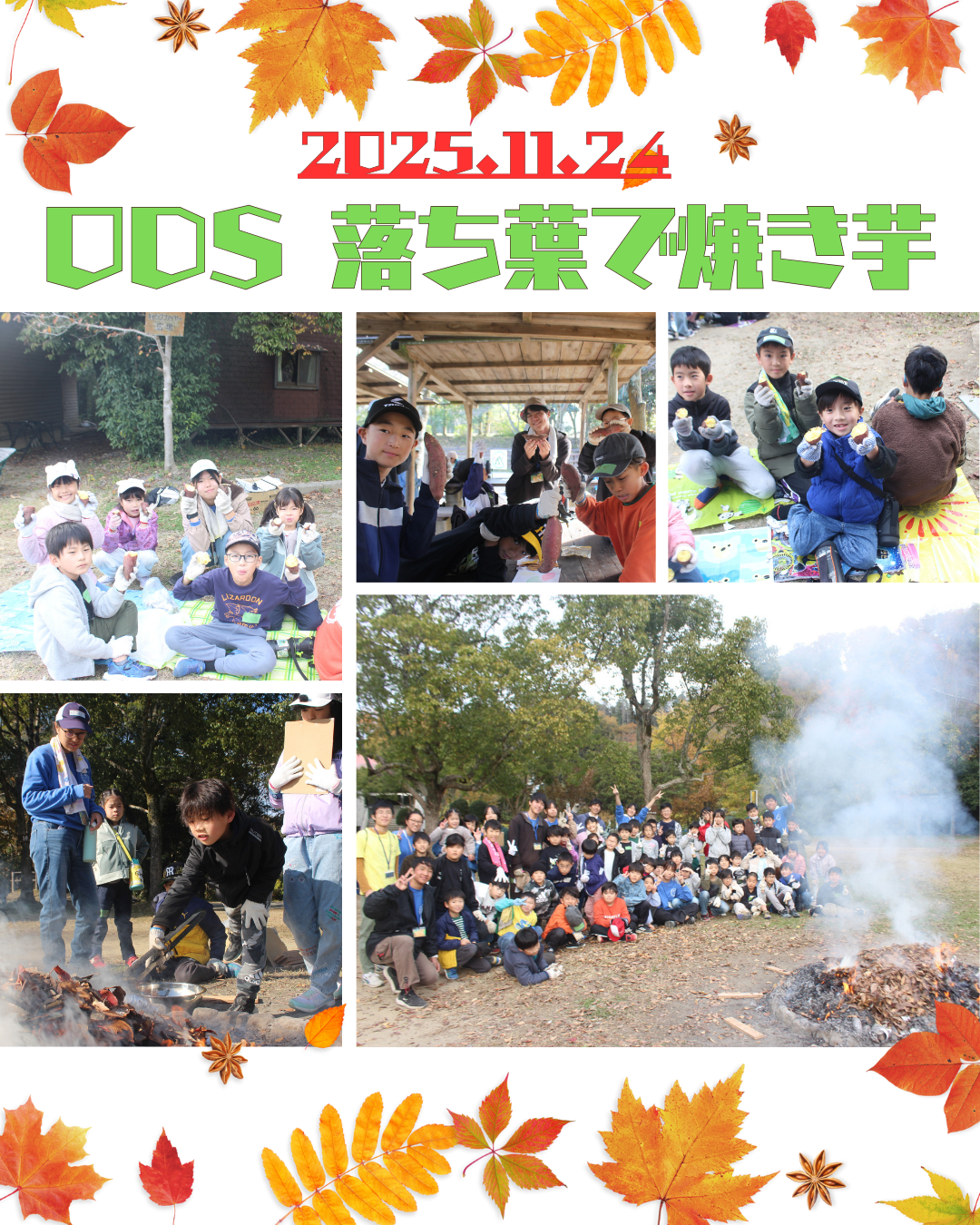 次に自分の焼き芋を選び、リーダーが焼いてくれている間にネイチャービンゴを行いました。班の皆で協力してビンゴを完成させていき、落ち葉を燃やしたことでワクワク感も高まり、より班の仲も良くなって行ったと思います。メインの皆で焼き芋を食べる時間では子ども達が自分で選んだ焼き芋を班の皆で一斉に割っていて、その瞬間はとても良い雰囲気でした。食べている時も皆笑顔で美味しいと言いながら食べていて最高のキャンプになりました。
