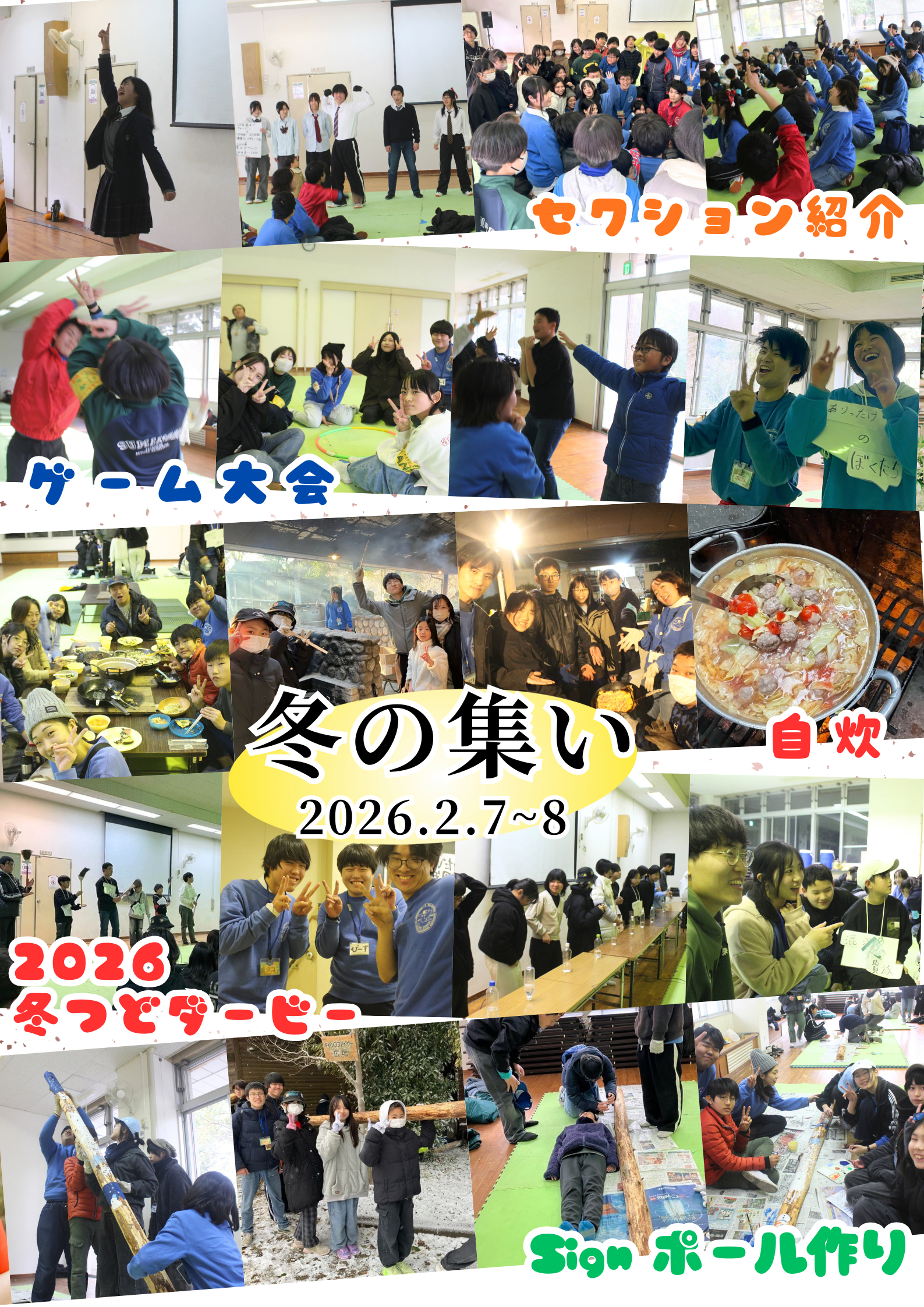 今回の冬のつどいはキャンピィだいとう40周年だったので、40周年ならではのプログラムが多くありました。今回も沢山の協会員やリーダー達が集まり賑やかで楽しい冬の集いになりました。初めは各セクションやDACだけでのプログラムだったり、お昼を過ぎたころには協会員さんやDAC、リーダー達が勢揃いしてオープニングアクトが行われたりしました。それぞれの代のセクション紹介などがあり代ごとに個性が出ていてすごく良いオープニングアクトになったと思います。夜は代ごとで夜プロを行い、親睦を深め合っていました。2日目メインプログラムであるサインポール作りでは、それぞれ季節や情景などが描かれていてとても良いサインポールが作れていたと思います。冬の集いが終わるまでみんなの笑顔が絶えないすごく良い冬のつどいになったと思いました。